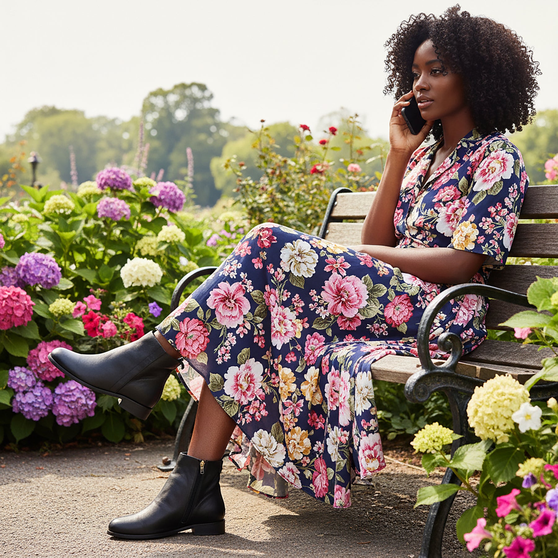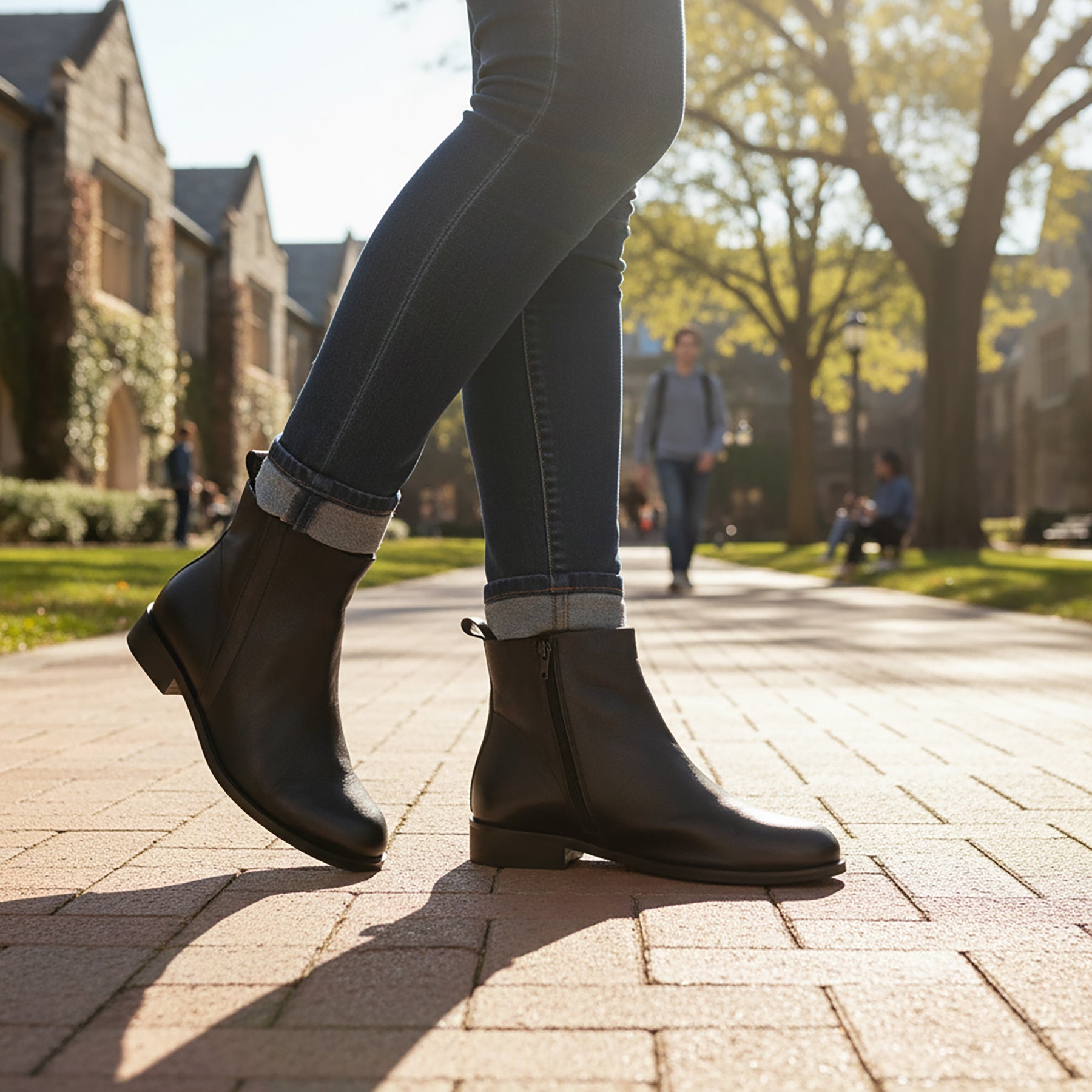 Classic black leather ankle bootie with a smooth leather upper.  The low heel boots feature an inside zipper and a flare ankle circumference for easy entry.