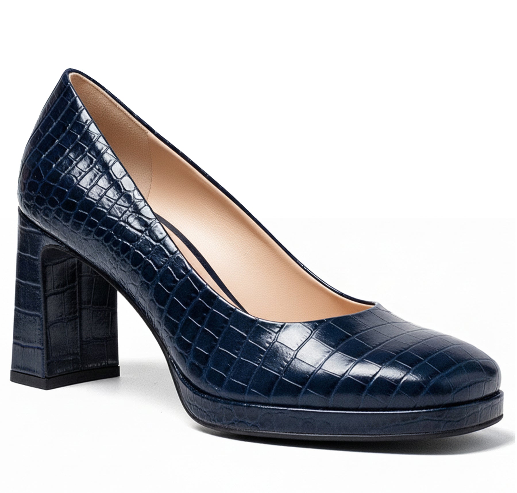 Cristina is an elegant low platform pump with a modern block heel. The stylish pair is crafted in navy embossed crocodile leather. The square-toe pump features a 6mm insole for comfort. This classic style effortlessly transitions from day to evening wear and is also available in suede.