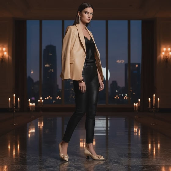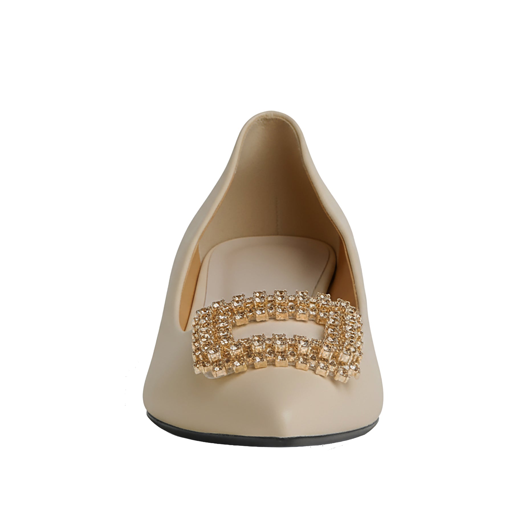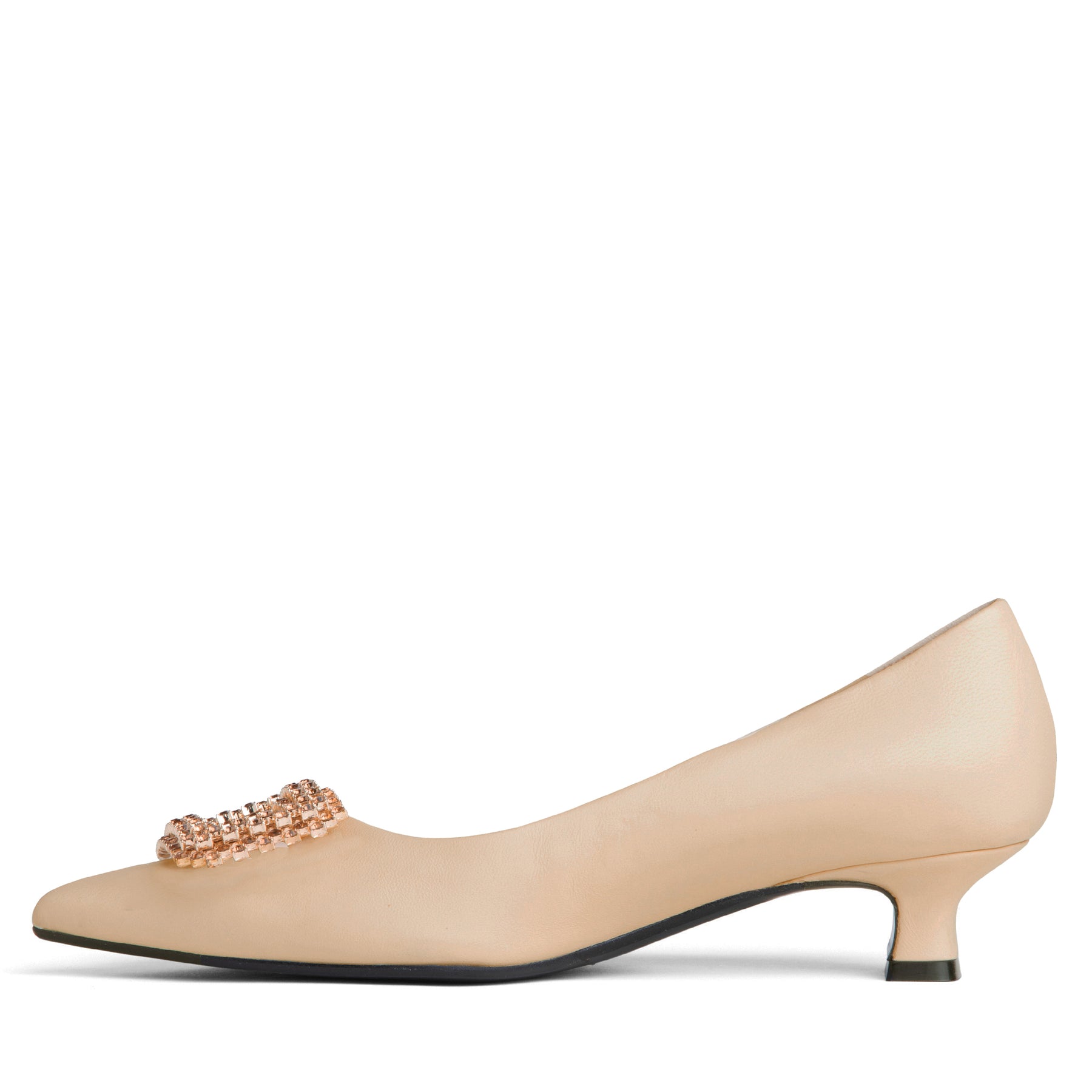 Elegant low heel soft leather beige pump. This charming pair features a rhinestone buckle to elevate your evening outfit.  Match it with the Scarlet bootie!