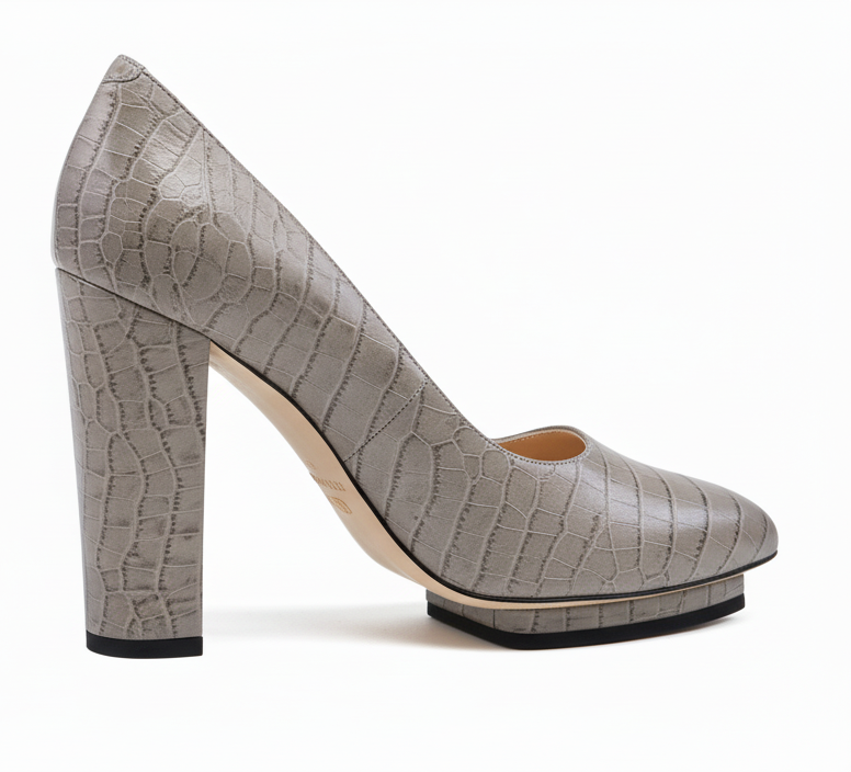 Refined embossed taupe leather pump. This stunning style features a hidden island platform to give you the height without the pitch and a back elastic to secure your heel in place.