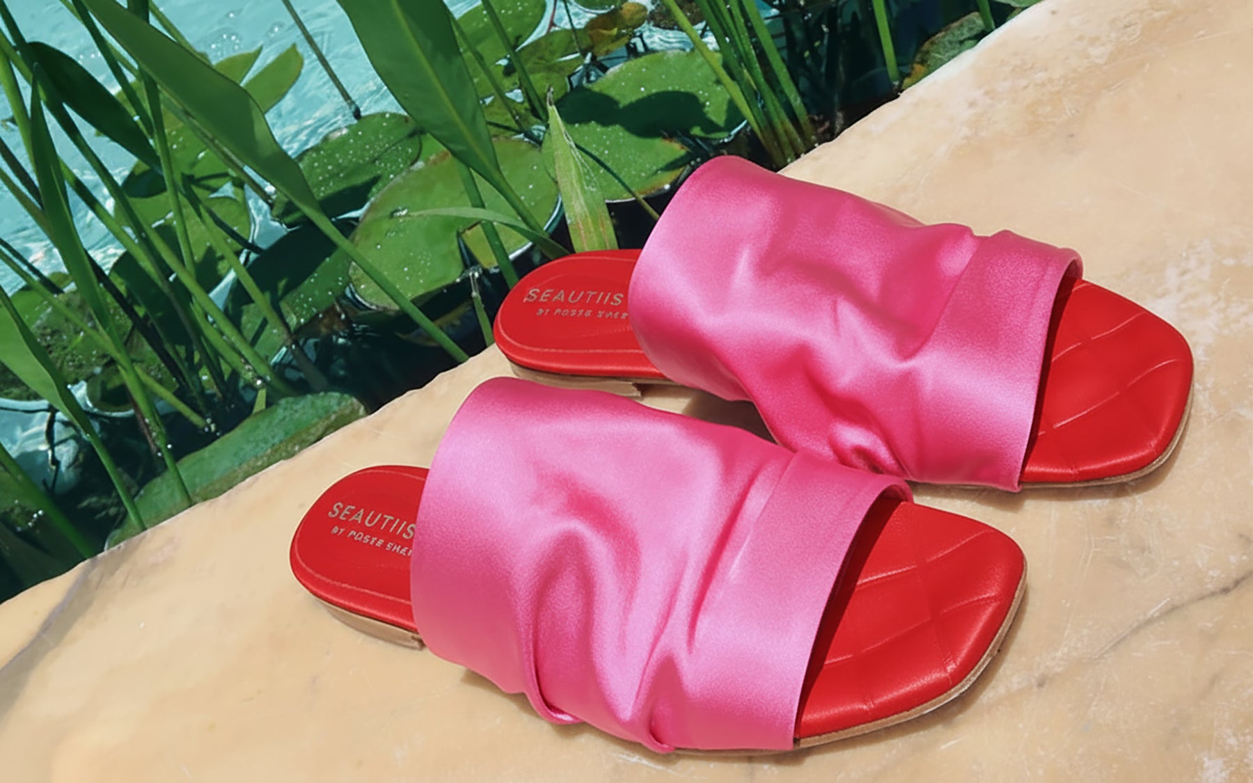 Colorful two-tone sandal slide-in. The flat features a red padded leather insole and a soft breathable hot pink stretch satin upper with a slouchy look and a light pink outsole.